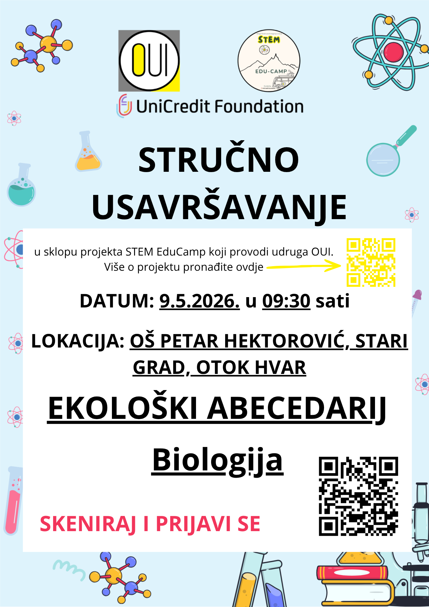 U sklopu projekta STEM EduCamp, uz financijsku potporu UniCredit Foundation, otvaramo prvi krug prijava za radionice u području biologije za stručna usavršavanja namijenjena učiteljima, nastavnicima i stručnim suradnicima koji rade s djecom od 1. do 8. razreda na području Splitsko-dalmatinske i Šibensko-kninske županije.