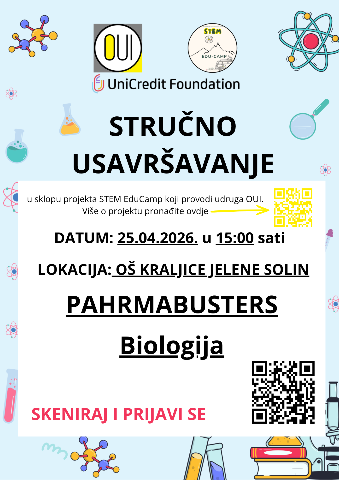 U sklopu projekta STEM EduCamp, uz financijsku potporu UniCredit Foundation, otvaramo prvi krug prijava za radionice u području biologije za stručna usavršavanja namijenjena učiteljima, nastavnicima i stručnim suradnicima koji rade s djecom od 1. do 8. razreda na području Splitsko-dalmatinske i Šibensko-kninske županije.